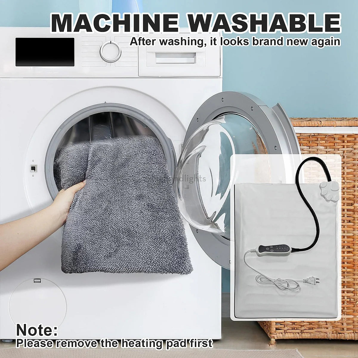 The soft fabric cover can be detached for machine washing. If needed, wipe the heating pad with a damp cloth. Always remove the heating pad before cleaning.